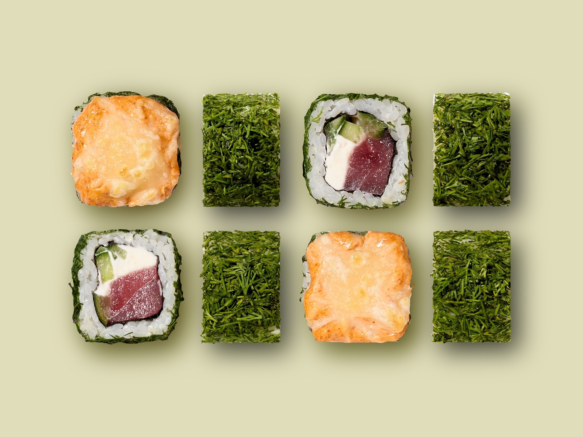 Филадельфия классическая 1, Сендай 1, Нежный тунец 1, Калифорния Блэк 1, Зеленая река 1, Лава 1, Ролл с авокадо 1, Ролл с тунцом 1, Муругай 1(острый), Кантри 1(острый), Гуру 1(острый), (запеченные роллы слегка теплые или холодные, запекается только шапочка)
